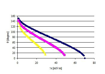 For measured values of q and gl the value of gs can be calculated by an iterative method via Eq. (V.16). The following Fig. V.4 demonstrates how the contact angle depends on the surface energy of the solid when a respective pure solvent is used (with hypothetical surface tensions of 70, 50 and 30 mN/m surface tensions, respectively).