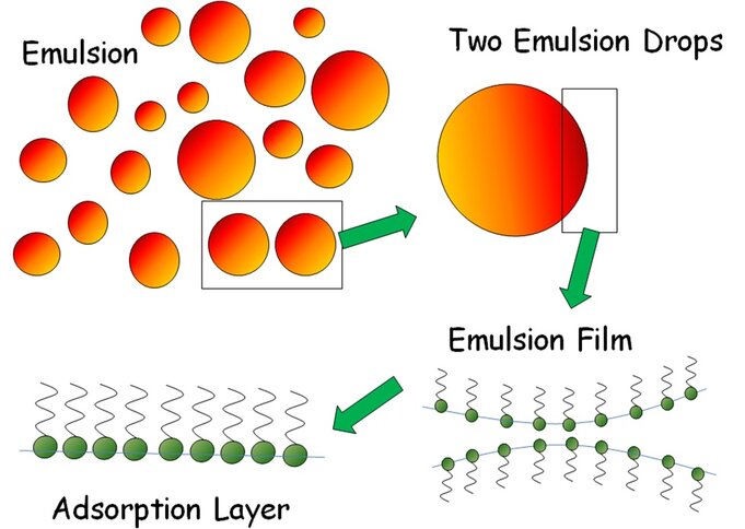 An emulsion consists of a huge number of drops of different size interacting with each other. When two drops contact each other a liquid film is formed which is stabilized by adsorbed molecules, here symbolized by adsorbed surfactants. The film is built up by two adsorption layers. Hence, the properties of these adsorption layers, also subjected to deformations like compression and expansion or shear, is of essential importance for understanding the formation and stabilisation of emulsions. The situation with foams has a lot in common with emulsions and similar problems arise.